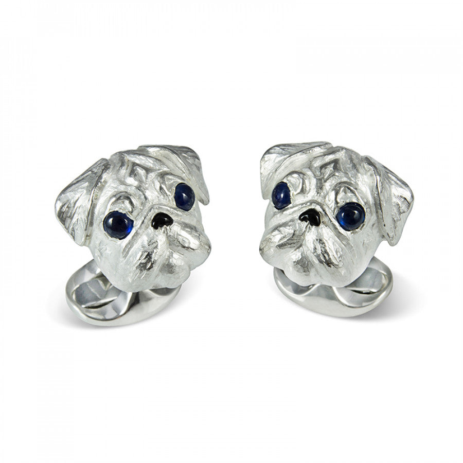 Pugs are known for being sociable, gentle companion dogs. With their wrinkly faces and glum expressions they have captured the hearts of the nation and are the favoured breed of dog with many people. Crafted from sterling silver, these beloved Pug dog cufflinks feature striking large blue cabochon sapphire eyes and will be totally devoted to your shirt cuff!
