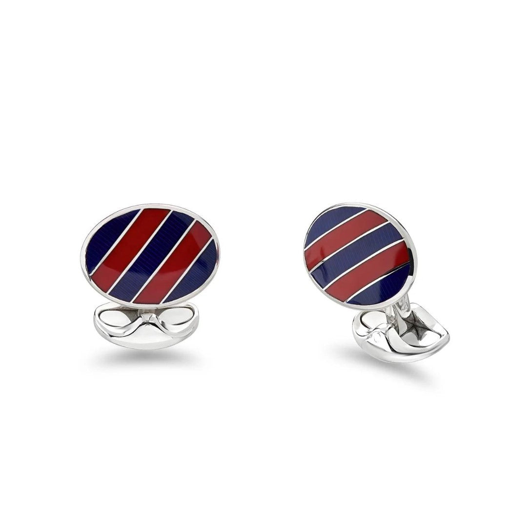 Here at Deakin & Francis we are masters in the art of vitreous enamelling, dating back to the Pharaohs, this is a highly specialised, hand skill. These sterling silver oval cufflinks have been hand-enamelled in navy blue and red horizontal stripes to give a striking end result.