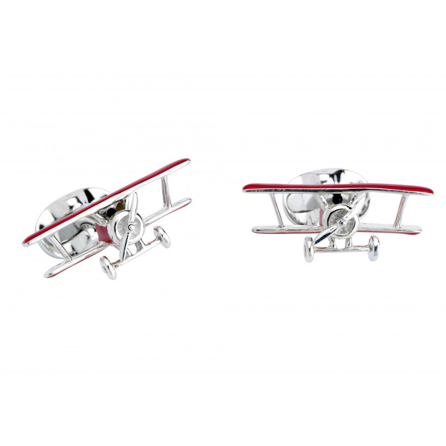 Inspired by the combat aircraft's of the Great War, these red, sterling silver Biplane cufflinks have a rotating propeller, just like the real thing. With one wing above the other on either side, the Biplane was the primary aircraft during the early days of flight.