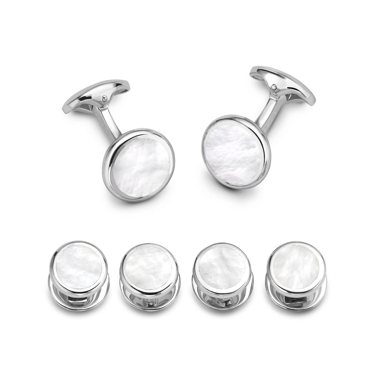 These classic, round sterling silver dress studs and cufflinks contain a smooth, hand-cut mother of pearl centre that will make any suit truly shine.