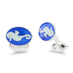 Created from the finest sterling silver and vitreous enamel, these sterling silver royal blue enamel cufflinks feature a light blue enamel seahorse centre. All of our vitreous enamel cufflink collection is expertly hand-enamelled to ensure the highest quality product. Vitreous enamelling is an art form that has been around for hundreds of years, today only a very small amount of companies still utilise this difficult and beautiful art. We are proud to still offer and utilise such a specialised method to create such wonderful blue cufflinks.