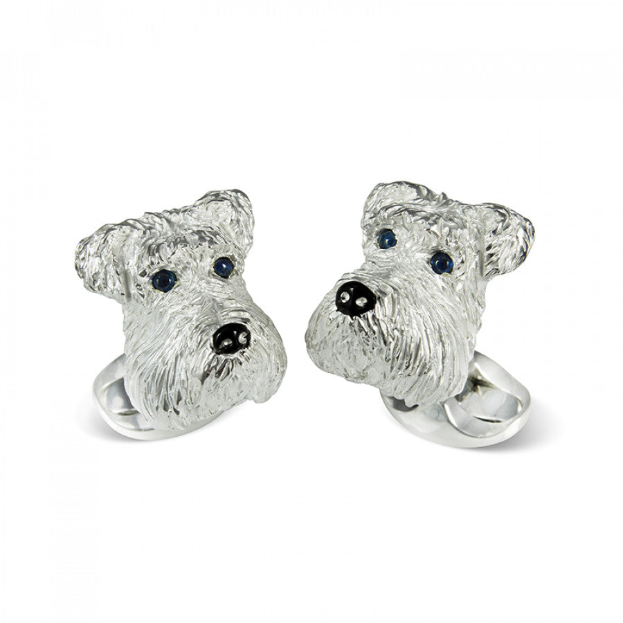 Originating in Wales, the Schnauzer Terrier has always been hugely popular with the Royal Family and these plucky, determined and tough little dogs are always ready for adventure! Our cleverly crafted sterling silver Schnauzer cufflinks captures their famous moustache and fluffy faces excellently. Finished beautifully with deep blue cabochon sapphire eyes and a black enamel nose these adorable cufflinks will be a hit with any dog lover!