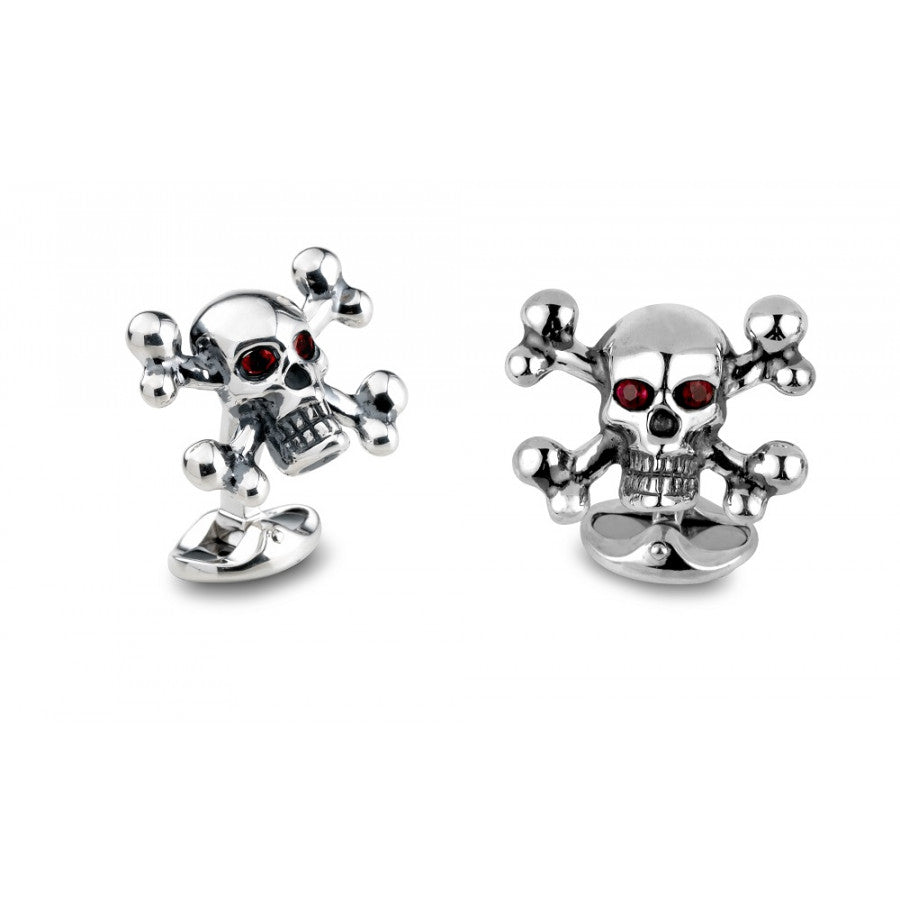 Sterling silver skull and cross bones cufflinks with ruby eyes.