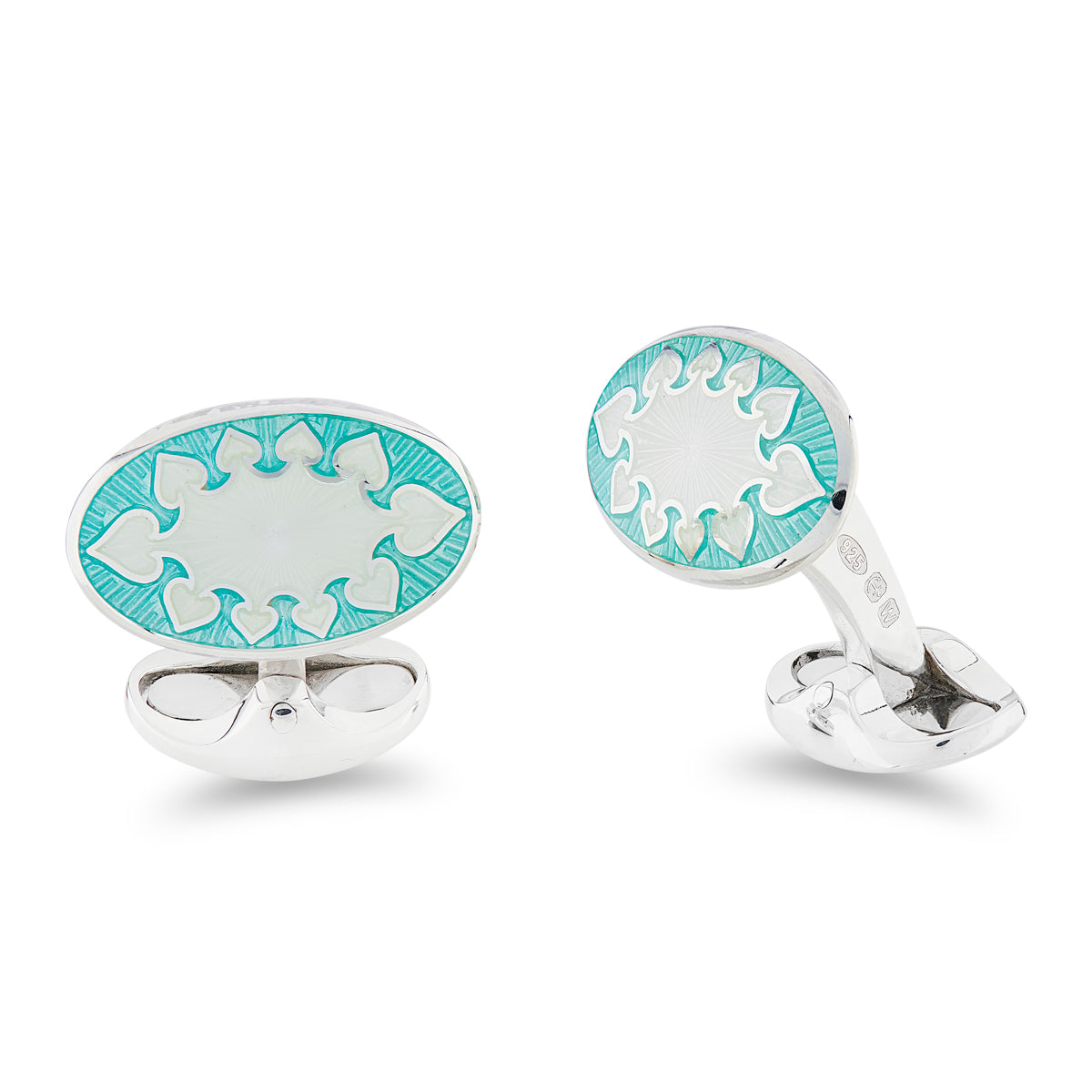 Created from the finest sterling silver and vitreous enamel, these sterling silver, oval cufflinks are classic with a timeless twist hand-enamelled in a turquoise and clear fancy pattern design. All of our vitreous enamel cufflink collection is expertly hand-enamelled to ensure the highest quality product. Vitreous enamelling is an art form that has been around for hundreds of years, today only a very small amount of companies still utilise this difficult and beautiful art. We are proud to still offer and utilise such a specialised method to create such wonderful pieces.