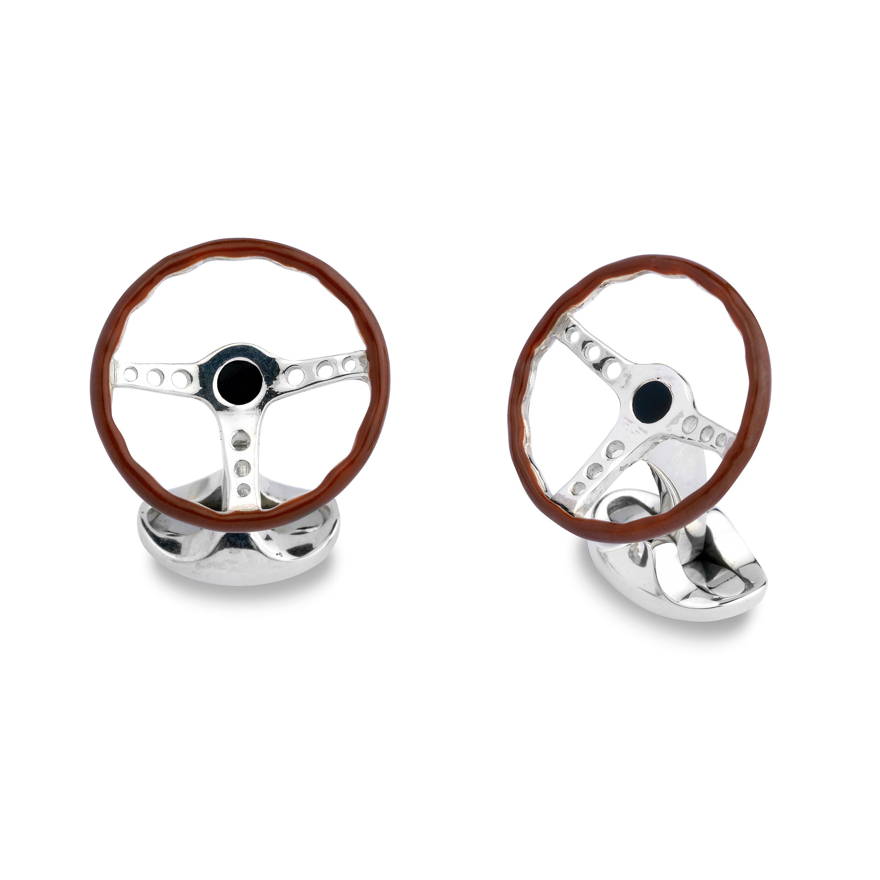 Sterling silver vintage steering wheel cufflinks with brown enamel finish and spring link fitting.