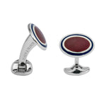 Sterling silver oval shaped cufflinks with hand-enamelled maroon red centre and royal blue border.