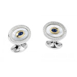 These oval, Sterling silver cufflinks contain a beautiful hand-cut mother-of-pearl inlay and are edged with a silver wreath pattern. With a striking sapphire blue stone centre that is enclosed by a ring of 18ct gold these cufflinks are the vision of the utmost opulence.