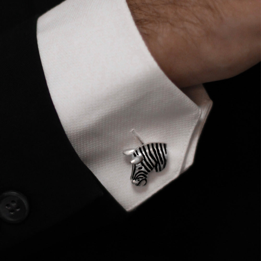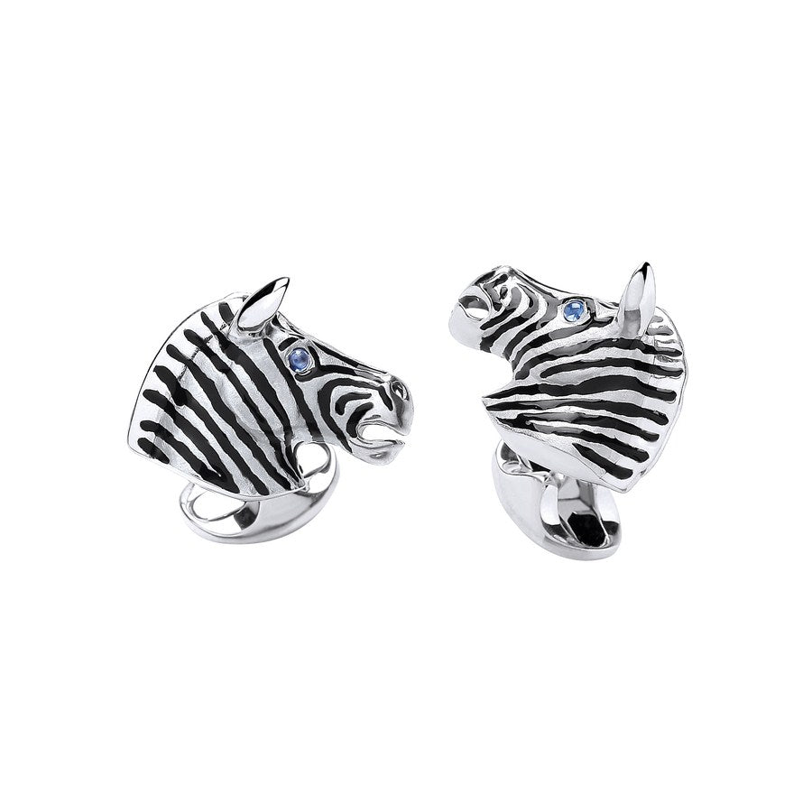 These sterling silver zebra cufflinks take the wearer for a walk on the wild side! Enamelled with black stripes and set with sapphire eyes it is part of the Safari Collection. Complete with a full set of Deakin & Francis traditional hallmarks for authenticity and domed spring link settings.