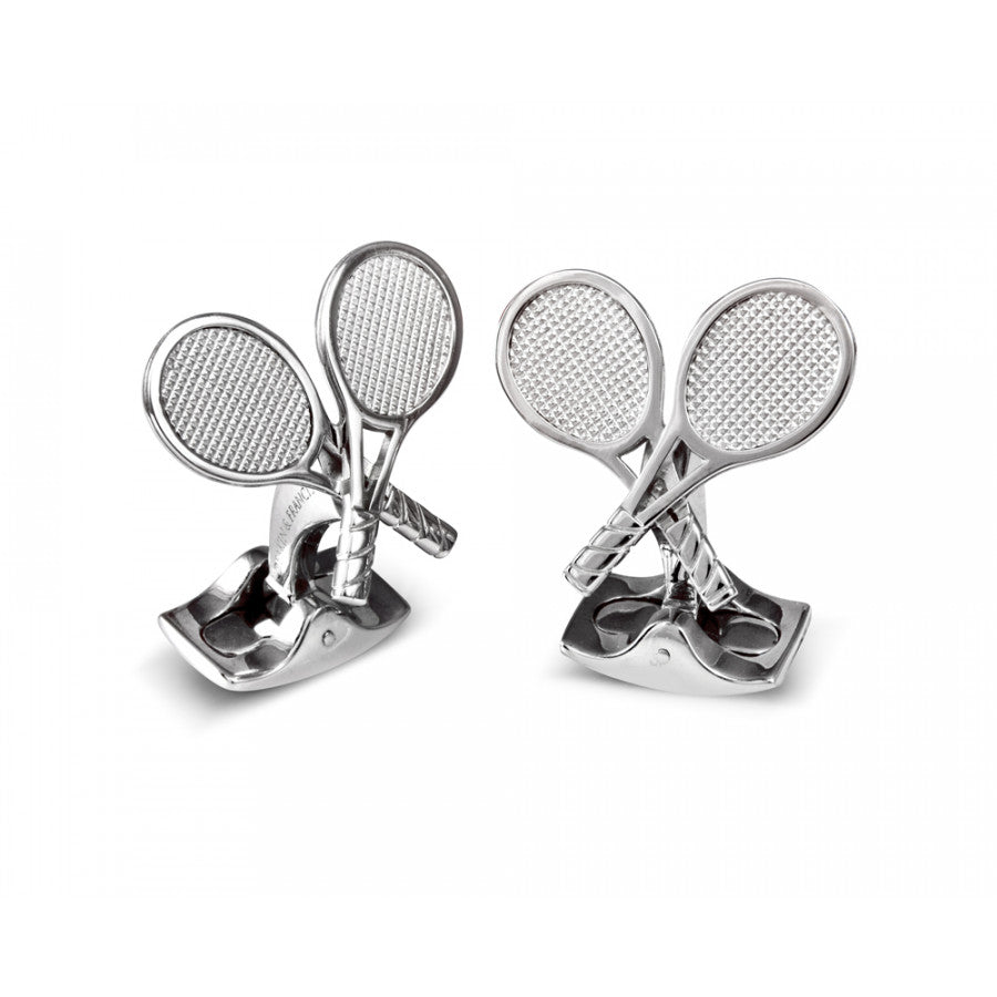 Game, set and match! It's a sure serve to victory with these tennis racket cufflinks. Meticulously detailed strings really bring these white rhodium plated rackets to life and will be the champions of your cuffs! These cufflinks are perfect for Wimbledon spectators.