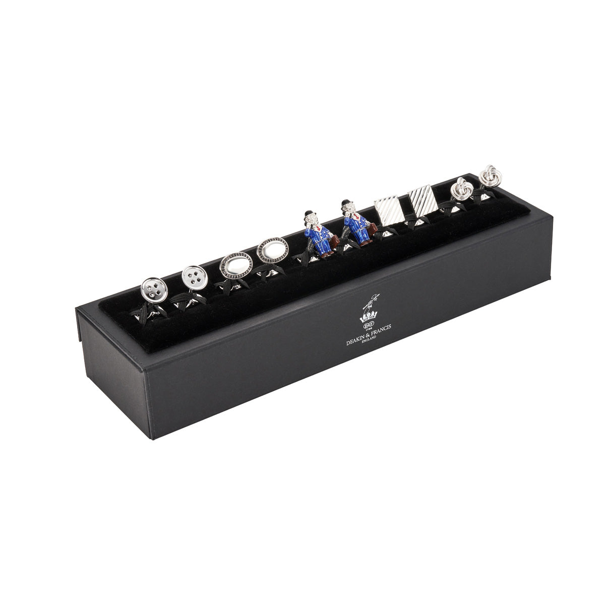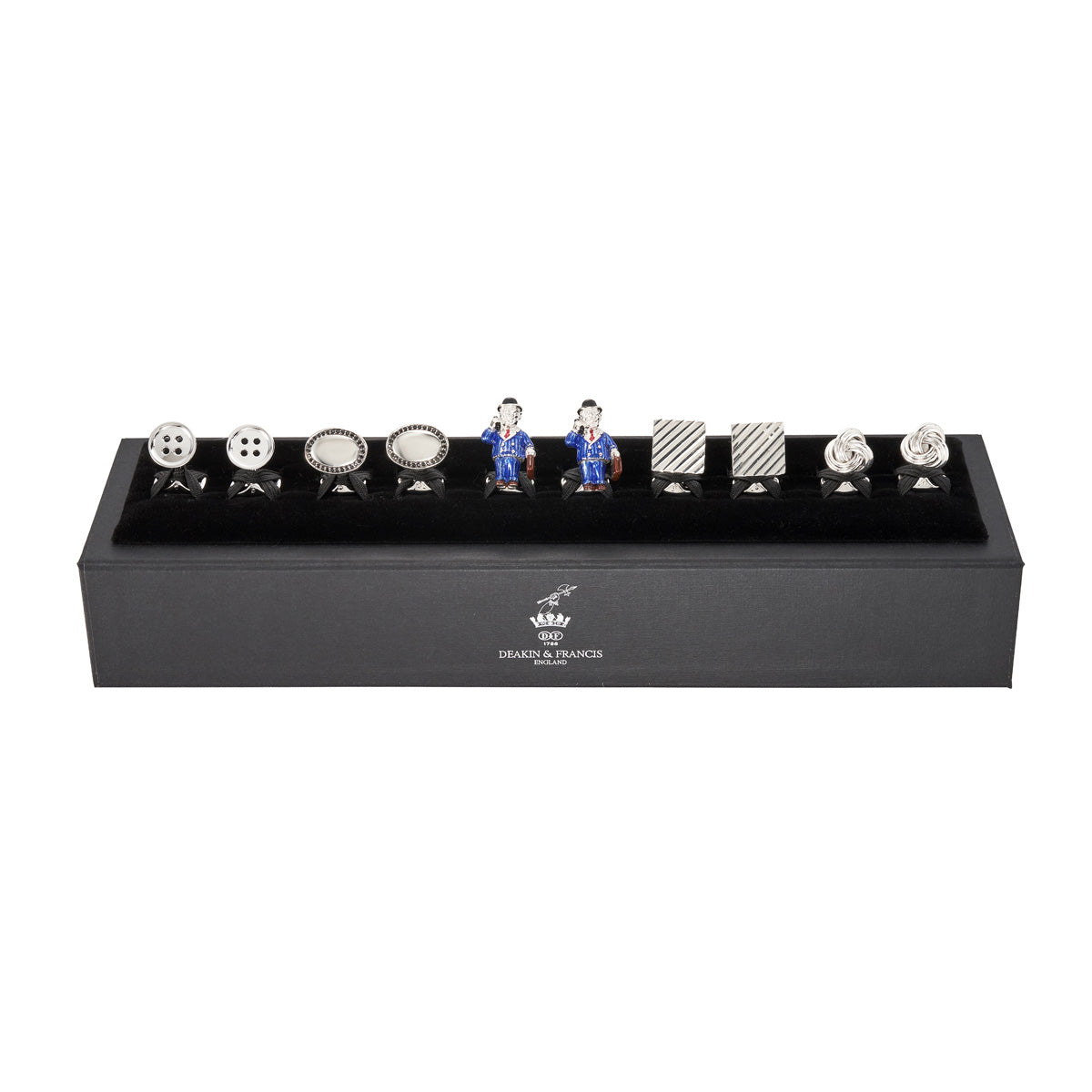 Elevate your executive style with the sophistication of Deakin & Francis' Executive Business Cufflink Set. Immerse yourself in the understated elegance of suave sterling silver buttons, a timeless accessory that complements any business ensemble with finesse. The enamelled businessman cufflinks exude professionalism, capturing the essence of corporate prowess. For a minimalist touch, the knots and sterling silver border cufflinks add a refined charm that speaks volumes in subtlety. Each piece in this collection is meticulously crafted to embody the essence of executive flair, making it an indispensable addition to your business wardrobe. Redefine sophistication in the boardroom with the Executive Business Cufflink Set where impeccable design meets the gravitas of corporate style.
