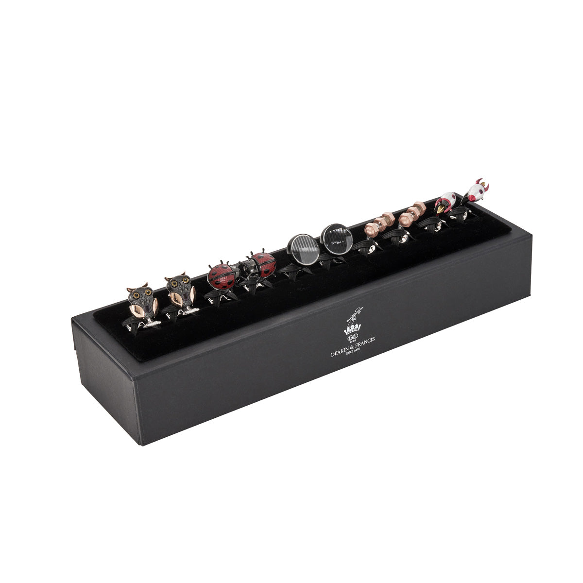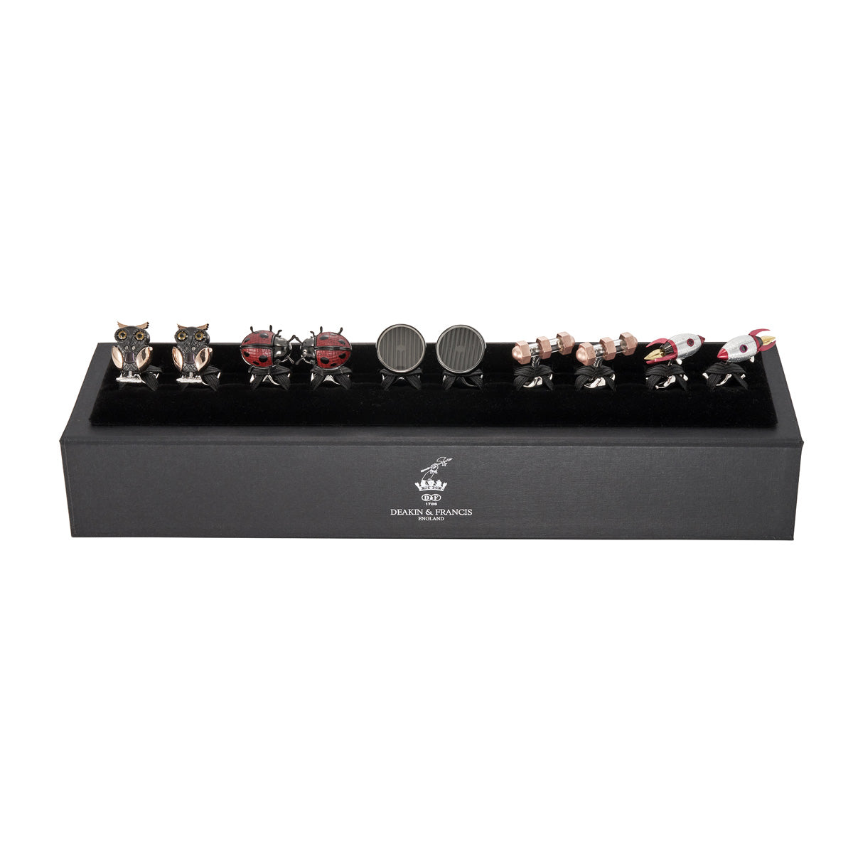 Infuse a touch of everyday enchantment into your style with the Everyday Moving Cufflink Set by Deakin & Francis. This whimsical collection boasts best-selling rockets with retractable flames, adding an element of playful surprise to your attire. The wing-lifting owl and ladybirds showcase nature's charm with a hint of kinetic magic, each cufflink possessing its own endearing quirk. For those who appreciate the dynamic, the set includes kinetic cufflinks, capturing attention with their captivating motion. Elevate your everyday ensemble with these charming accessories that effortlessly blend quirkiness and style. Make a statement with the Everyday Moving Cufflink Set a celebration of the delightful and the dynamic in every detail.