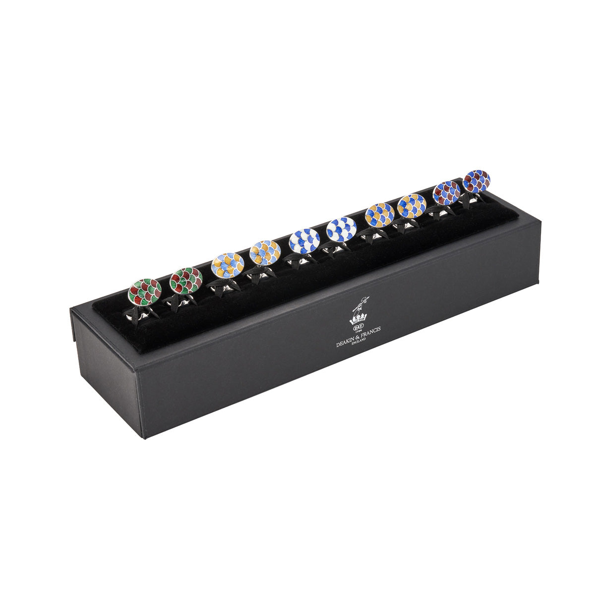 Elevate your ensemble with the timeless elegance of the Classic Pattern Cufflink Set by Deakin & Francis. Expertly crafted using the refined art of vitreous enamelling, these cufflinks boast a classic pattern that transcends trends and suits a variety of occasions. The array of colours available in this collection ensures versatility, allowing you to seamlessly integrate them into any outfit or design preference. Mastered by the skilled craftsmen at Deakin & Francis, the technique of vitreous enamelling imparts a lasting vibrancy to each pair. Make a sophisticated statement at weddings, business meetings, or any formal affair with the Classic Pattern Cufflink Set a testament to the enduring craftsmanship and timeless appeal of Deakin & Francis.