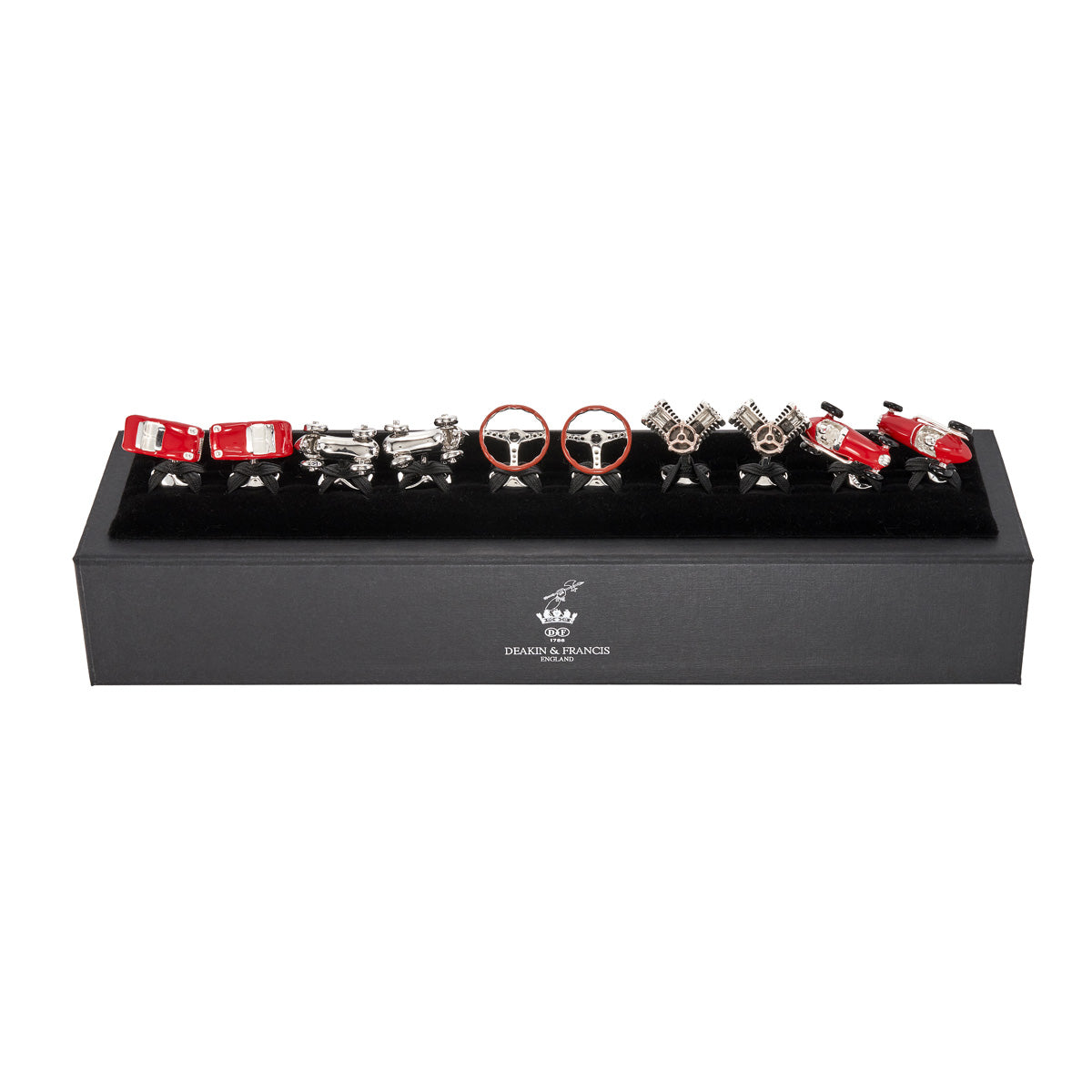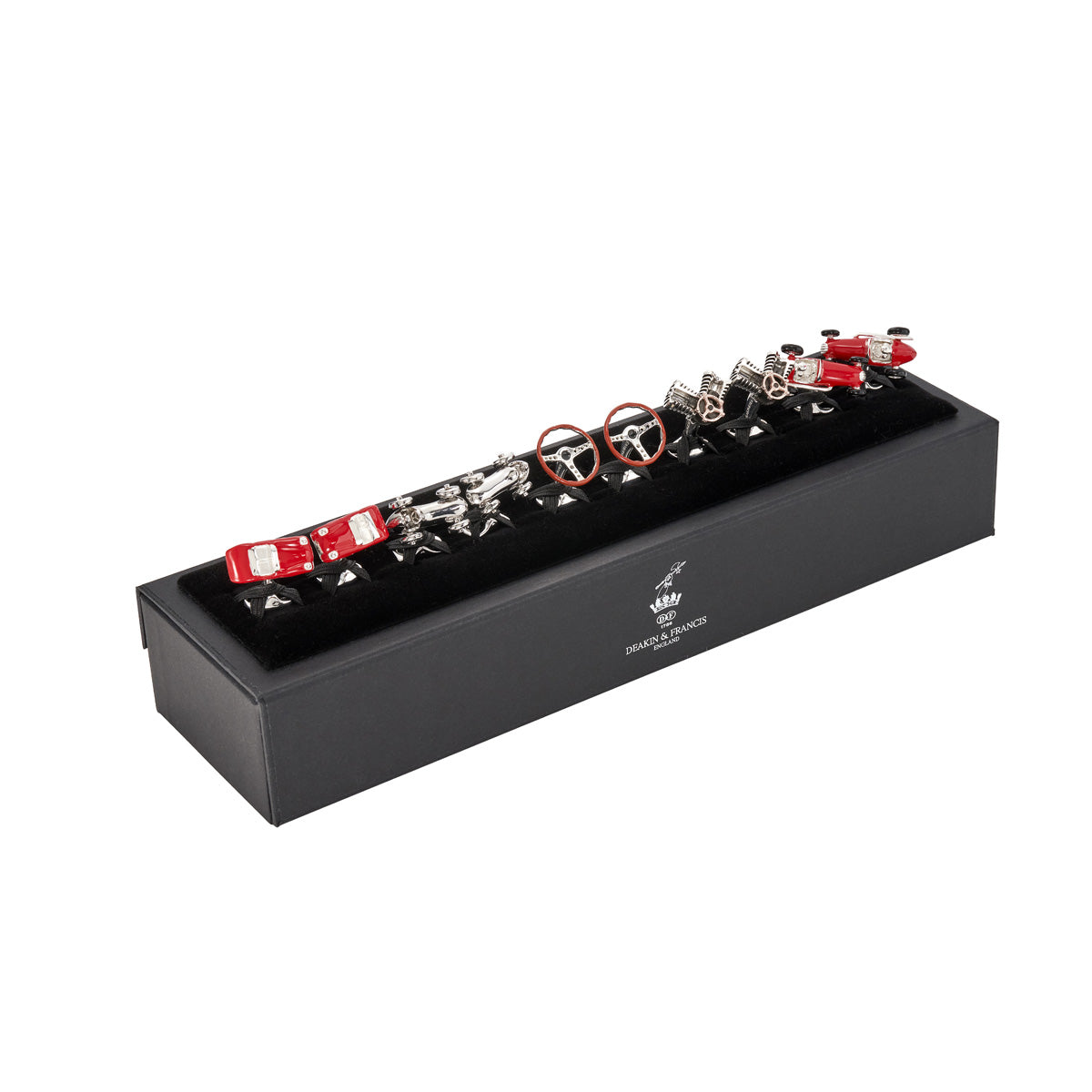 Rev up your style with Deakin & Francis' Car Enthusiast Cufflink Collection, a dynamic tribute to the thrill of the road. Crafted with precision and passion, this set features moving pistons that capture the essence of automotive engineering. Immerse yourself in the nostalgia of a classic 1930s racing car, complete with intricate details that pay homage to the golden age of motor racing. The vintage steering wheel adds a touch of retro charm, while the contemporary sports car embodies the cutting-edge spirit of modern automotive design. Available in a variety of enamels and silver finishes, these cufflinks are a sleek and stylish expression of your love for all things automotive. Embrace the open road and showcase your passion with the Car Enthusiast Cufflink Collection where craftsmanship meets the thrill of the drive.