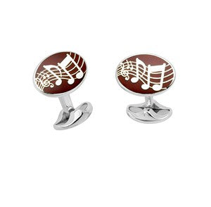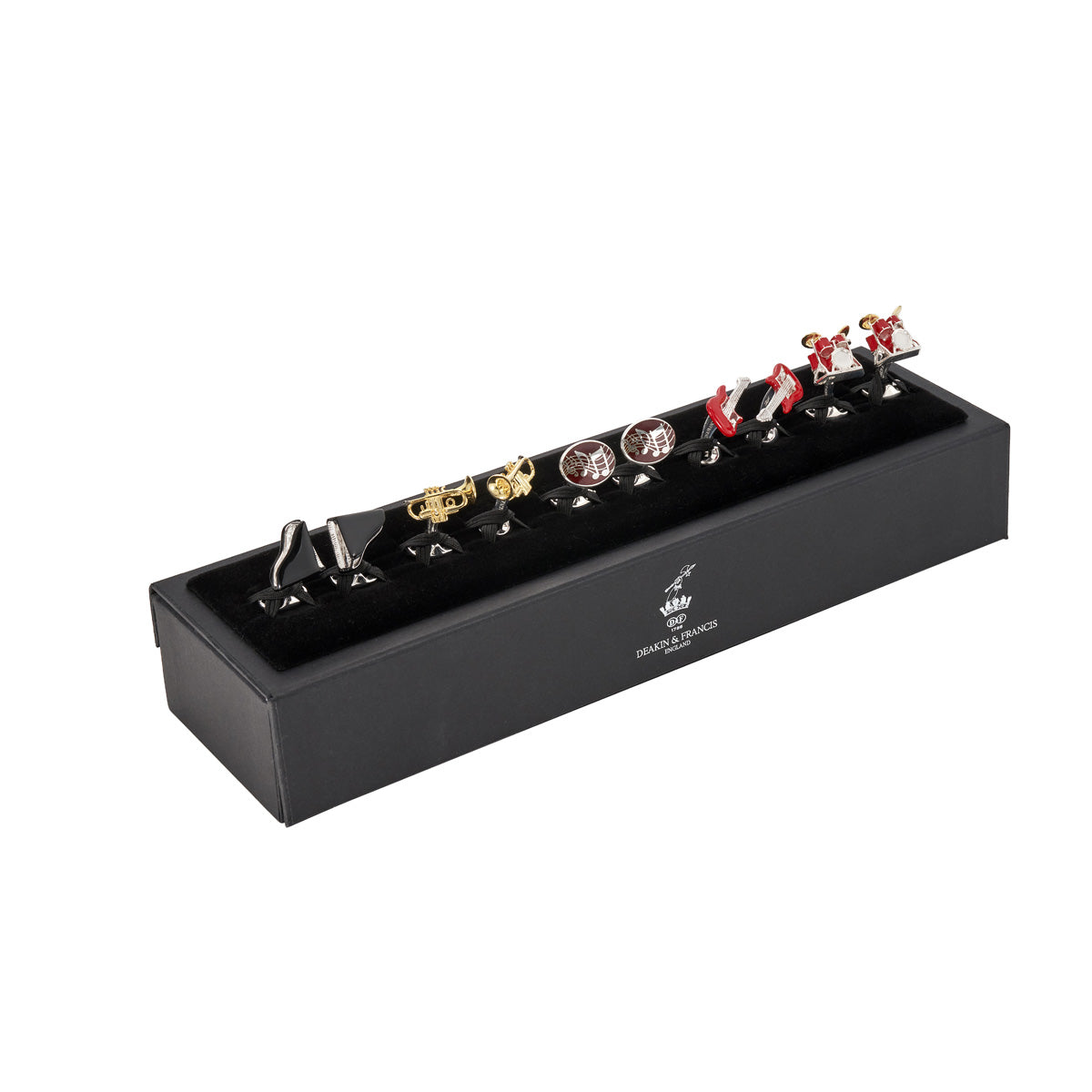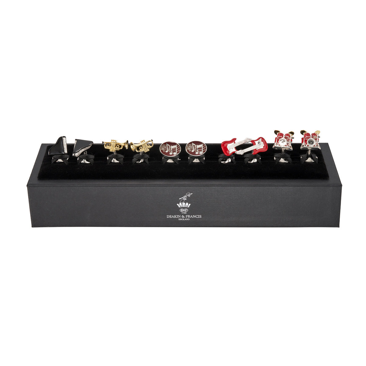 Strike the perfect chord in style with Deakin & Francis' Music Enthusiast Cufflink Set. Immerse yourself in the rhythm with stratocaster-inspired enamel guitars, capturing the essence of musical craftsmanship. The full drum kit cufflinks add a dynamic beat to your ensemble, while vitreous enamelled music notes dance across your sleeves in perfect harmony. For the brass aficionado, gold-plated trumpets evoke the soulful sounds of jazz, while the virtuoso grand piano cufflink pays homage to classical elegance. Crafted in sterling silver, each piece in this collection is a symphony of artistic expression for the discerning music enthusiast. Elevate your style and celebrate your love for music with the Music Enthusiast Cufflink Set where every note is a masterpiece.