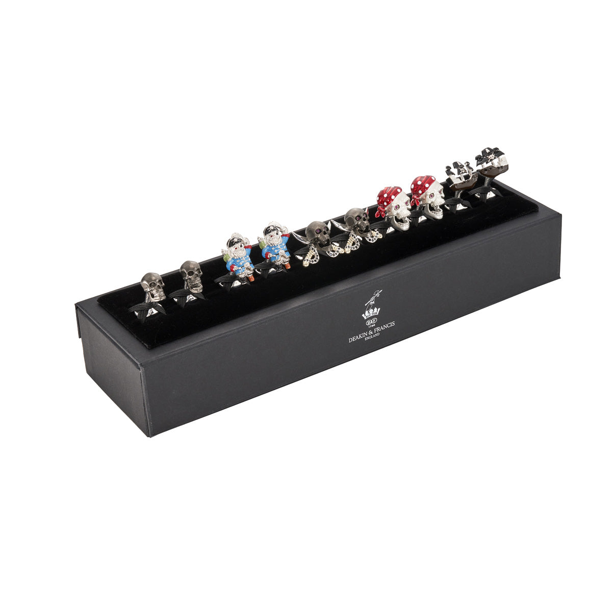 Embark on a daring voyage with our Pirate Adventure Cufflink Set, a treasure trove of swashbuckling style for the modern adventurer. Handcrafted with precision, this collection boasts sterling silver cufflinks adorned with ruby-eyed pirate skulls, adding a touch of mystique to your attire. The set also features an enamelled pirate captain with a perched parrot, a vibrant tribute to the high seas. The ensemble is completed with an enamelled pirate ship and oxidised skulls, evoking the spirit of maritime daring and adventure. For those with a taste for the unconventional, these cufflinks promise to infuse your look with a bold and daring flair that's perfect for any buccaneer at heart. Raise the anchor and set sail with the Pirate Adventure Cufflink Set where style meets seafaring escapades.