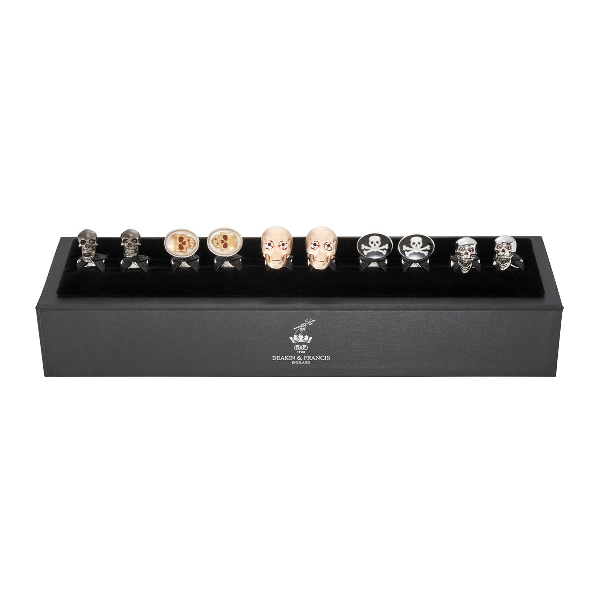 Embrace the bold and iconic with Deakin & Francis' Skull Cufflinks our signature insignia that defines daring sophistication. Available in a striking array of colours, from the enigmatic vitreous enamelled black to the eye-popping rose gold finish and the edgy oxidised sterling silver, these cufflinks are the epitome of audacious style. Crafted with meticulous attention to detail, the skull design stands out as a symbol of fearless individuality. Whether you're opting for a mysterious look or a touch of rebellious elegance, our Skull Cufflinks are a must-have accessory. Elevate your style with the unmistakable insignia of Deakin & Francis, where daring design meets impeccable craftsmanship.