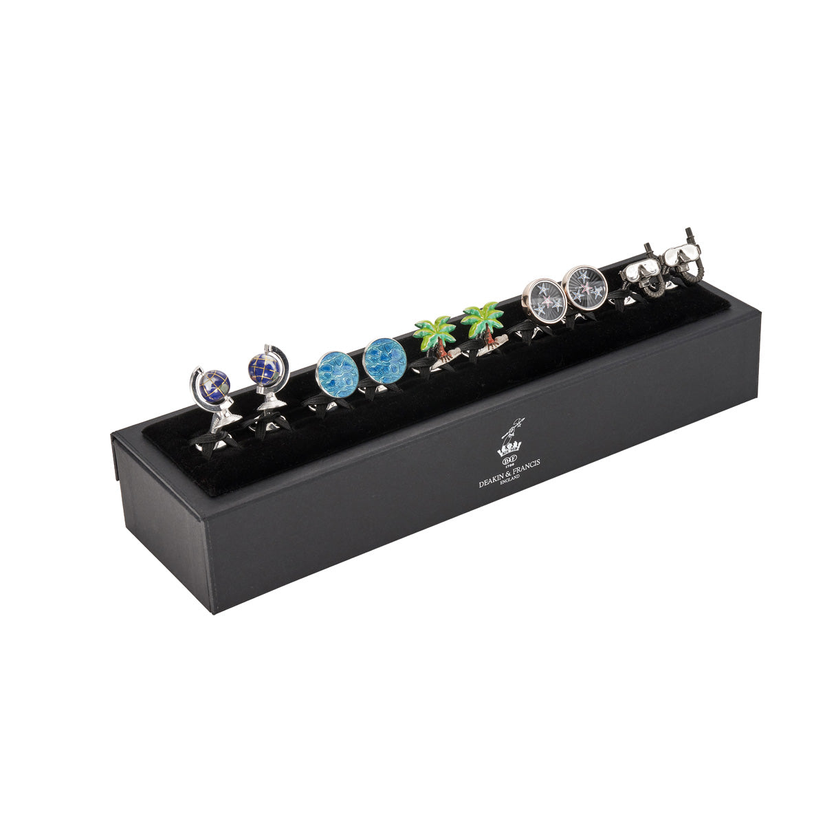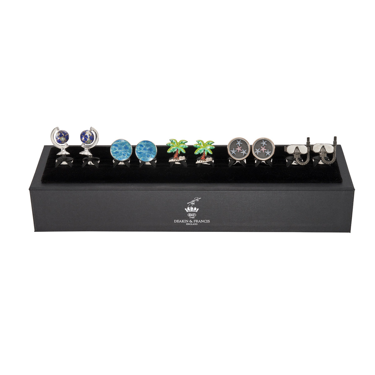 Transport yourself to the sun-soaked paradise with Deakin & Francis' Summer Holiday Cufflink Set. Embark on a global adventure with lapis lazuli globe cufflinks, symbolizing your love for exploration and wanderlust. Dive into the refreshing beauty of vitreous enamel pool cufflinks, capturing the essence of a tropical oasis. The palm trees bring a touch of island allure, while the oxidised snorkels and starfish evoke memories of endless warm holidays. Each cufflink is a passport to the sun-soaked memories, yearning to be relived. Indulge in the spirit of eternal summer with this vibrant and nostalgic Summer Holiday Cufflink Set - where every piece is a cherished reminder of the joyous warmth of holidays past.