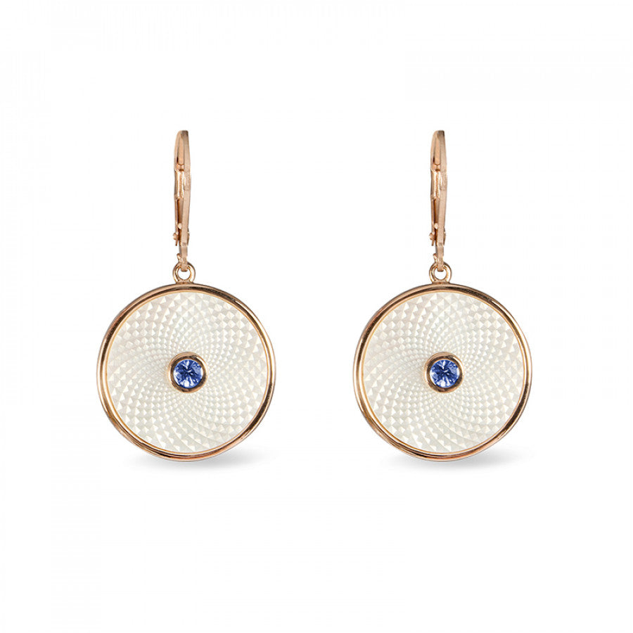 These stunning sterling silver earrings are the perfect, everlasting choice for the sophisticated woman. With its beautiful lustre and iridescence the mother-of-pearl inlay, these round designs are encased in a rose gold plated setting and are beautifully finished with a sparkling blue sapphire gemstone centre.